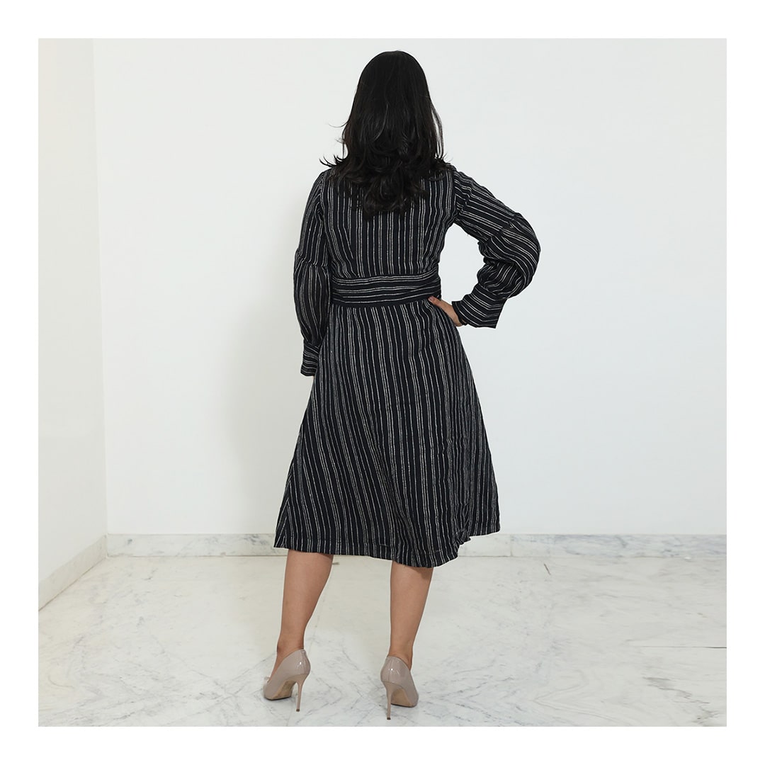 V-neck dress with long sleeves featuring three different sleeve styles, finished with simple cuffs. The front has a button-down design, and the fitted waist gently flares into an A-line skirt. A perfect symbol of confidence and effortless elegance.