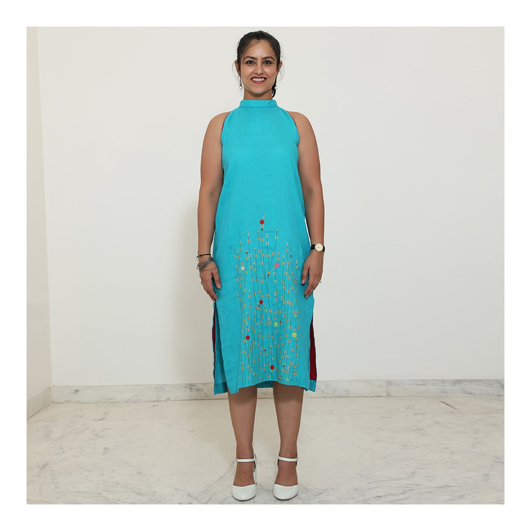 Firoza Linen Halter Dress with Adda Embroidery