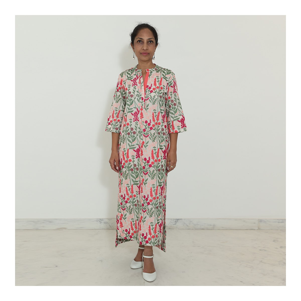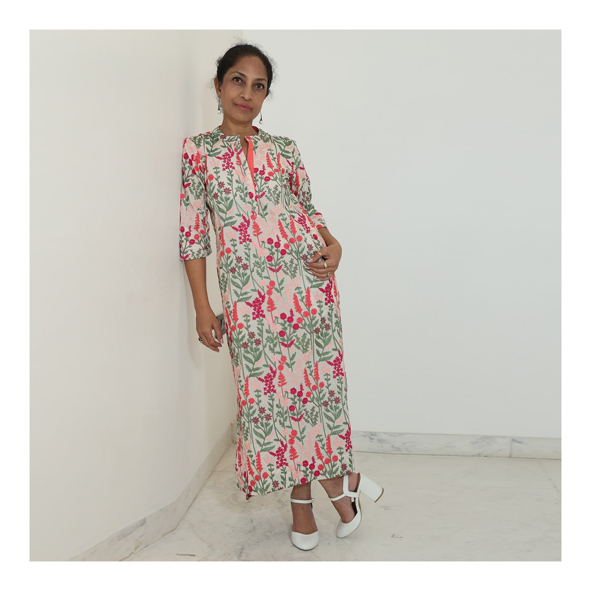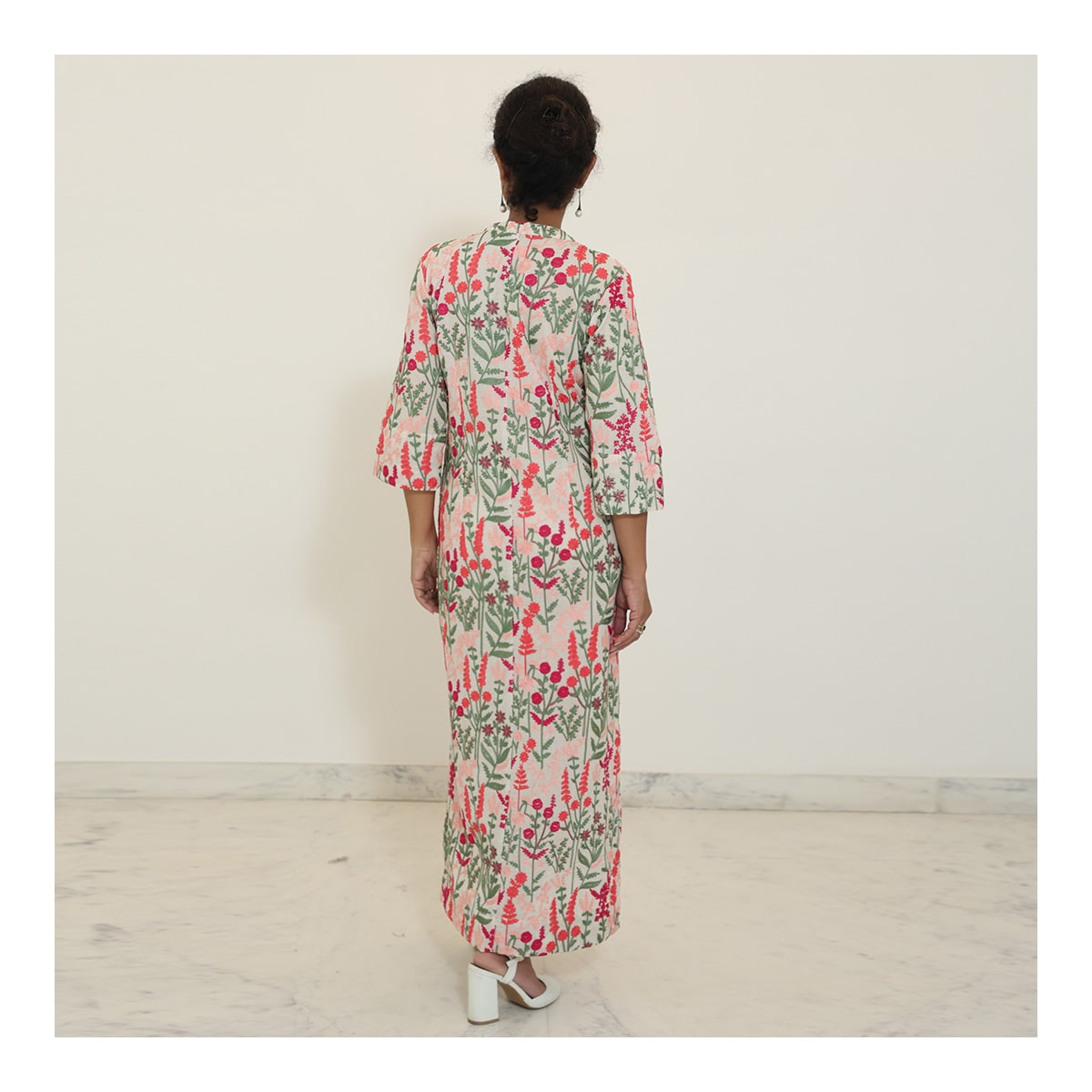 Cotton dress with machine embroidery in a lovely floral pattern, featuring soft pink and green hues. Designed with a front placket and ¾-length sleeves, this comfy and stylish outfit is perfect for a casual day out.